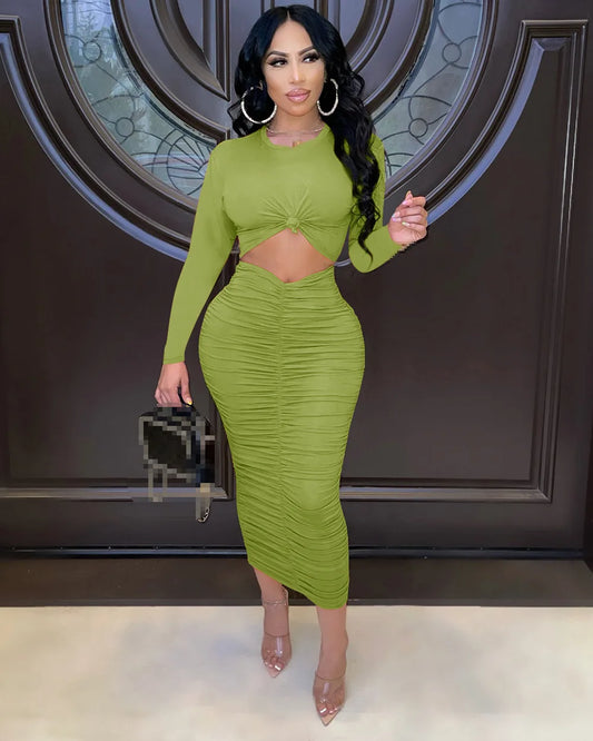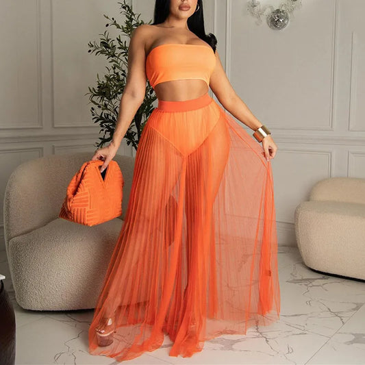 Beyprern Beautiful Pleated Cropped Top + High Slit Resort Skirt Set