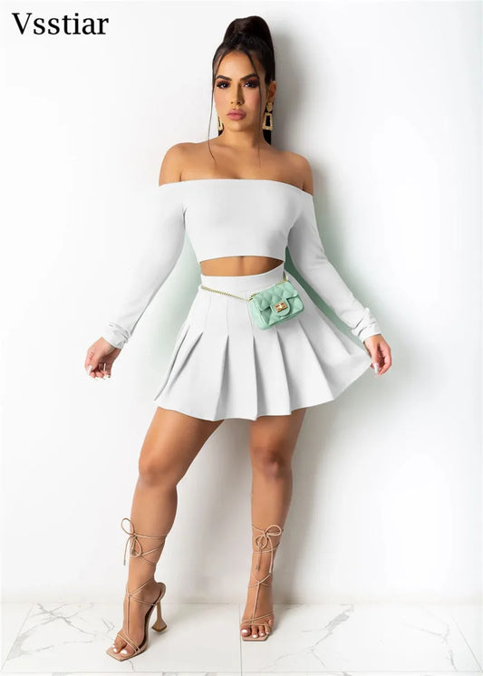 Off Shoulder Slash Neck Long Sleeve Crop Top Pleated Mini Skirt